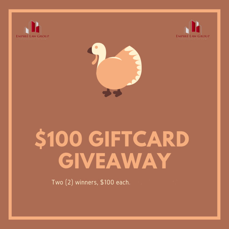 The Winner(s) of the Campaign (the “Winner”) will receive $100 each in the form of a giftcard. Actual/appraised value may differ at time of prize award and the appraised value is not the same as the face value. The specifics of the prize shall be solely determined by Empire Law Group. No cash or other prize substitution shall be permitted except at Empire Law Group discretion. Any and all prize-related expenses, including without limitation any and all federal, state, and/or local taxes, shall be the sole responsibility of Winner. No substitution of prize or transfer/assignment of prize to others or request for the cash equivalent by Winner is permitted. Acceptance of prize constitutes permission for Empire Law Group to use Winner’s name, likeness, and entry for purposes of advertising and trade without further compensation, unless prohibited by law.